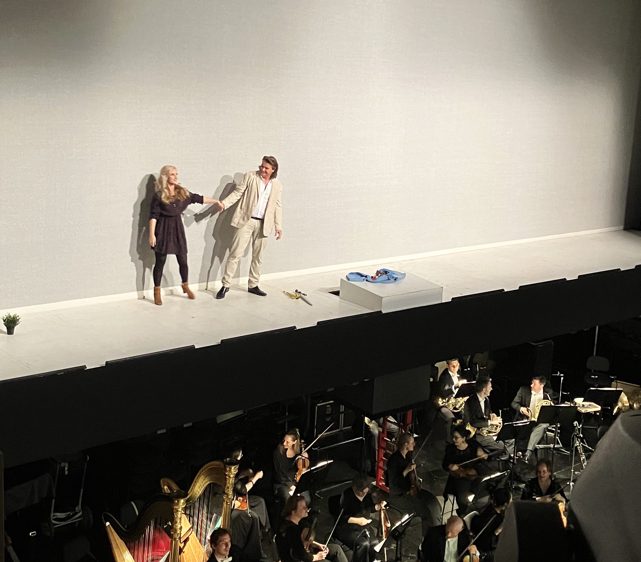 Als weißer Held und Ritter zelebriert Klaus Florian Vogt wortgenaue Nüchternheit. Der Zuhörer erlebt die Wonnen der Textdeutlichkeit. Freilich weckt des tendenziell sinnlichkeitsfreie Singen die Sehnsucht nach Jonas Kaufmann. Und doch ist Vogt mitreißend, macht bella figura in weißem Hemd und formeller Freizeithose. Als Einspringer für Schager ist er am Mittwoch besser in Form als am Sonntag. Vertretbar auch das Fallen ins Quasi-Reden bei besonders wichtigen Momenten (wie Strauss es im Rosenkavalier wollte), wenn ich mich recht erinnere, bei Weh uns, was tatest du!
