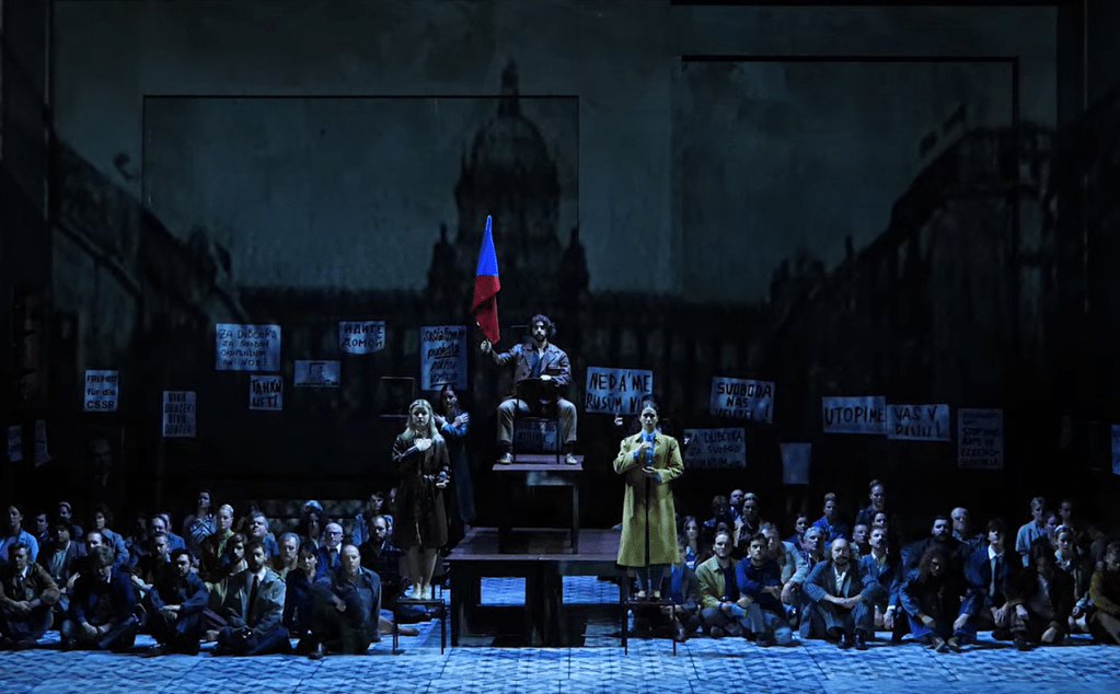 Robert Carsen inszeniert diese Nicht-Oper als tschechische Geschichts-Revue vom Ende der 1960er. Das ist lustig. Reicht aber nicht ganz. Die ersten Menschen auf dem Mond waren nicht Neil Armstrong und Buzz Aldrin, sondern Prager Kneipiers. Man sieht jede Menge TV-Bilder, Prager Frühling, Woodstock, Eishockey ČSSR-UdSSR. Ist man hier bei BBC History oder doch bei Terra X History? Das bleibt einfach ziemlich vorhersehbar (Video Dominik Žižka). Auch die hopsenden Choreos auf dem Mond sind ausbaufähig (Choreographie Rebecca Howell).
