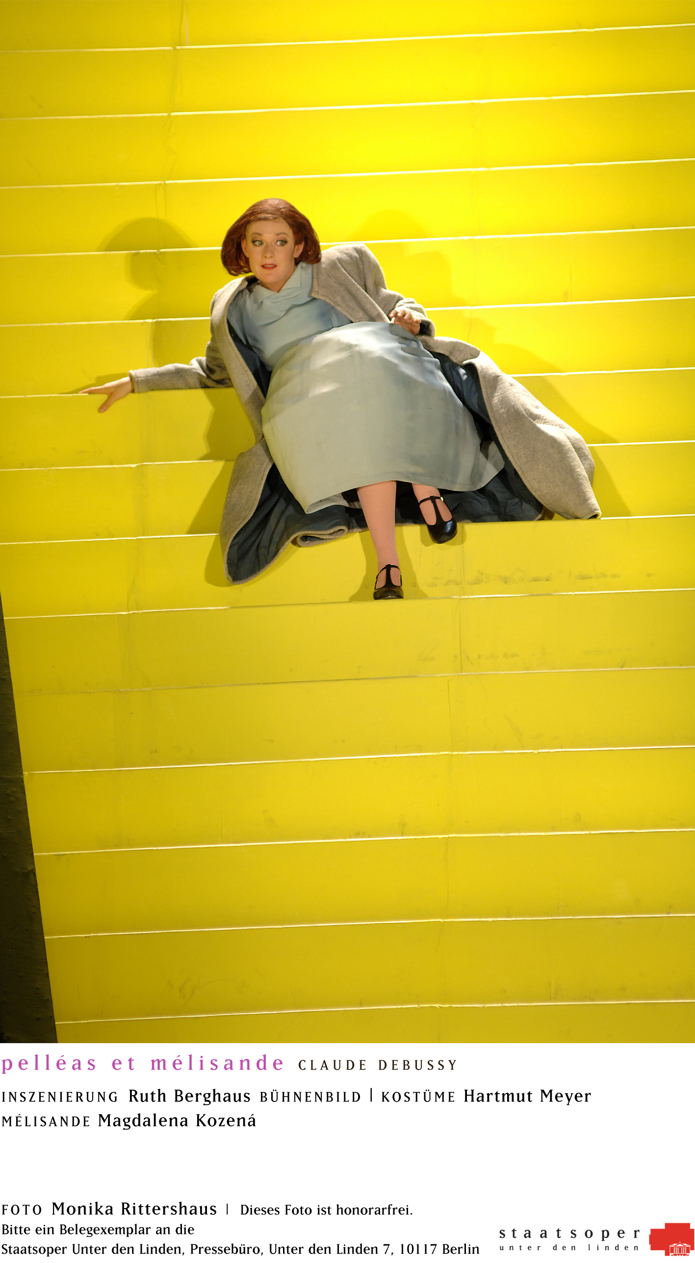 Da liegt sie! Magdalena Kozena (Mélisande) vor gelber, getreppter Wand // Foto: Monika Rittershaus / .staatsoper-berlin.de